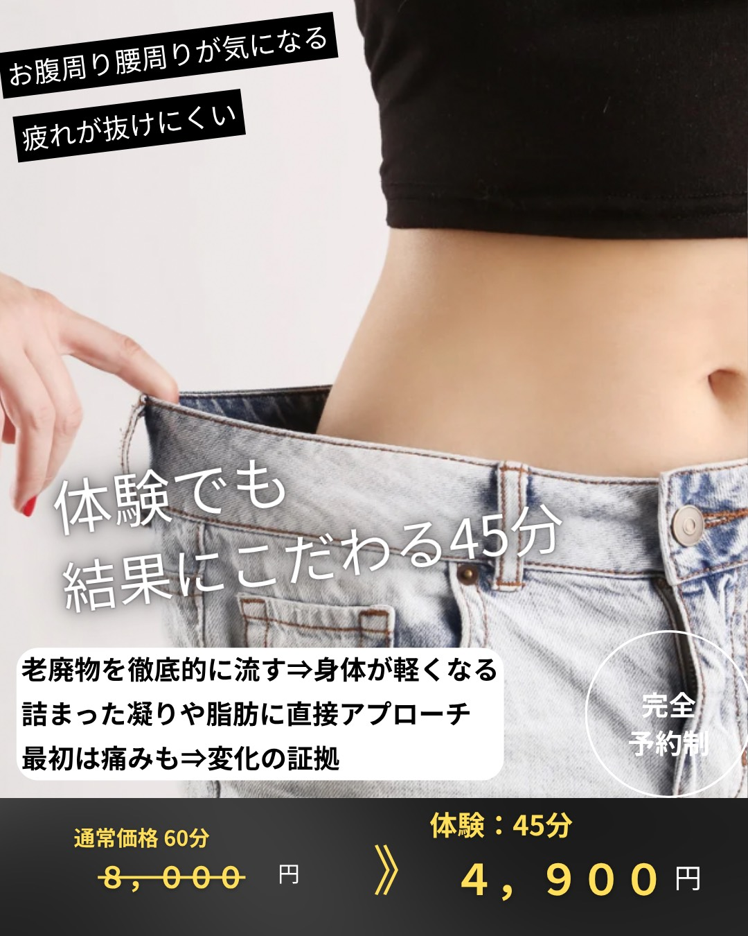 〇お腹まわりにスッキリ感を 確実に感じられる 体験1回 45分 |
